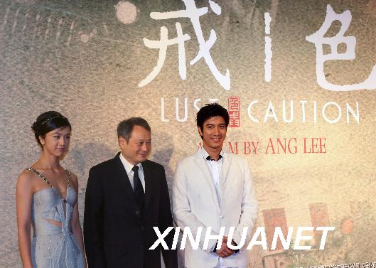 2007年10月31日晚,導演李安(中)和演員湯唯(左)、王力宏在首映禮上。當晚,電影《色·戒》在上海影城舉行內地首映禮。新華社記者劉穎攝