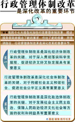 黨的十七大報告首次提出建設服務型政府,為第6次行政管理體制改革指明了方向。十七屆二中全會強調,要著眼于科學發展、改善民生,在大部門體制改革等方面邁出重要步伐!