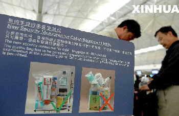 (資料圖)2007年3月21日, 香港機場管理局在客運大樓貼出新保安措施的告示。當日,香港國際機場實施新保安措施,所有離港及轉機旅客只能隨身攜帶容量不超過100毫升的液體、凝膠及噴霧物品,并須放在一個密封的透明膠袋內。 新華社記者呂小煒攝