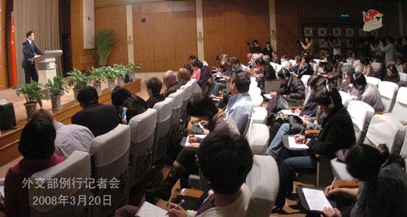 2008年3月20日下午,外交部發言人秦剛舉行例行記者會,就近期拉薩發生的打砸搶燒嚴重暴力犯罪事件等問題答問。