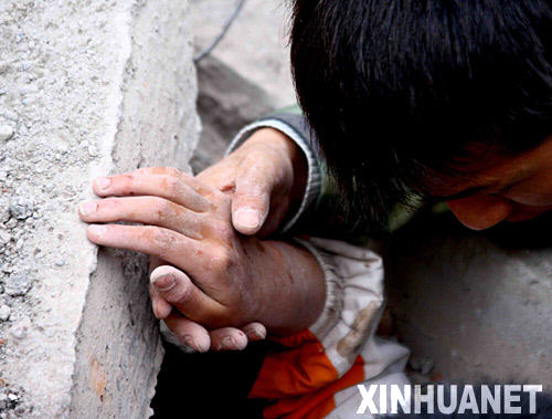 5月13日,救護(hù)人員在漢旺鎮(zhèn)武都小學(xué)廢墟上搶救幸存的小學(xué)生。四川綿竹市漢旺鎮(zhèn)武都小學(xué)的教學(xué)樓在地震中倒塌,眾多師生被埋在倒塌的校舍中。救援行動(dòng)正在積極展開。 新華社記者 陳建力攝