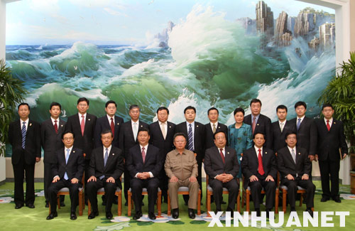 6月18日,朝鮮勞動黨總書記、國防委員會委員長金正日在朝鮮平壤百花園國賓館會見中共中央政治局常委、國家副主席習近平。這是會見前合影。 新華社記者 蘭紅光 攝