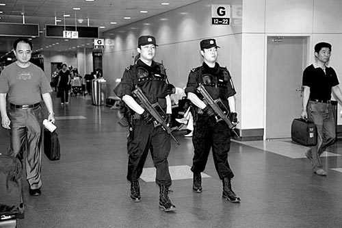 持槍武裝特警開始在首都機(jī)場各航站樓進(jìn)行巡邏。資料圖片