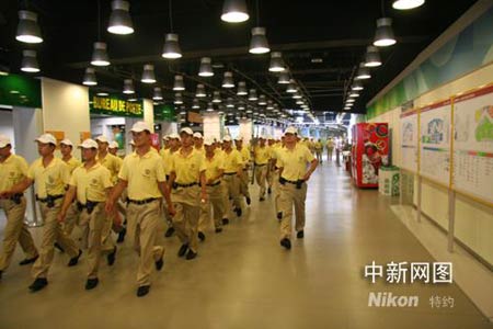 由來自軍方和警方的北京奧運會安保人員,以及軍犬和警犬等組成的安保聯隊,今天在北京奧運會主新聞中心(MPC)進行統一的搜索、排除爆炸物工作。記者前往主新聞中心配合搜爆、排爆,目擊了這一過程。
