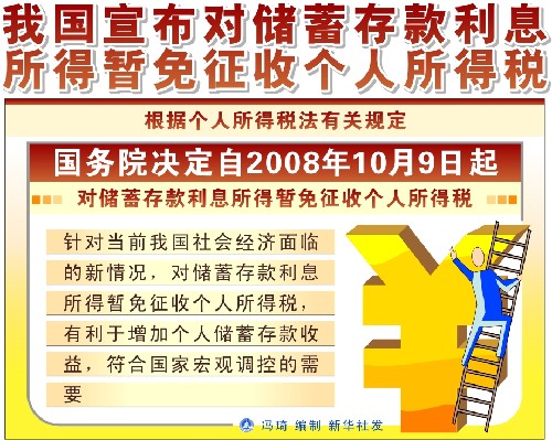 新華社北京10月8日電(記者 韓潔、王宇)根據個人所得稅法有關規定,國務院決定自2008年10月9日起,對儲蓄存款利息所得暫免征收個人所得稅。