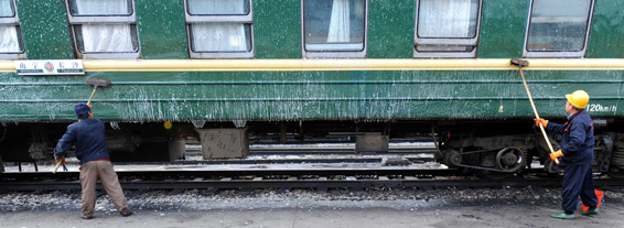 1月8日,工作人員正在對列車進行全面清洗。隨著30組臨客在長沙的全部集結到位,1月8日,廣鐵集團2009年春運湖南地區準備工作基本就緒。2009年春運將于1月11日正式開始,長沙客運段已備足全部旅客列車的相關物品,并吸取去年冰雪災害運輸教訓,制定應急預案,儲備應急設備,確保春運工作安全有序進行。 新華社記者 趙眾志 攝