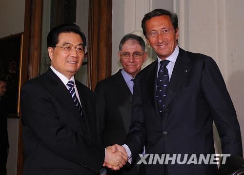 7月6日,中國國家主席胡錦濤在羅馬會見意大利眾議長菲尼。新華社記者 樊如鈞 攝
