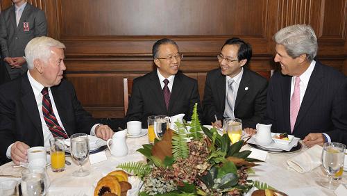 7月29日,中國(guó)國(guó)務(wù)委員戴秉國(guó)(左二)在美國(guó)華盛頓與美國(guó)國(guó)會(huì)參議員克里(右一)、盧格(左一)等共進(jìn)早餐。 新華社記者 張巖 攝