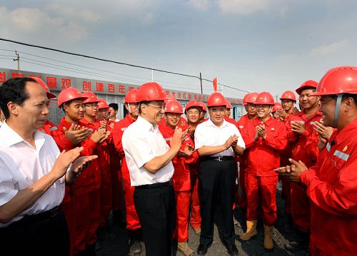 李克強來到鐵人王進喜生前工作生活過的大慶油田1205鉆井隊以及大慶石化公司,看望慰問一線工人,考察采油新技術新工藝,了解企業生產經營情況。他鼓勵企業深挖開采潛力,保持油田高產穩產,發展接續產業,為保障國家能源安全、進一步繁榮地方經濟作出新貢獻。李克強希望廣大干部職工繼續弘揚愛國創業求實奉獻的大慶精神、鐵人精神,在振興老工業基地的實踐中取得新成就、實現新跨越。