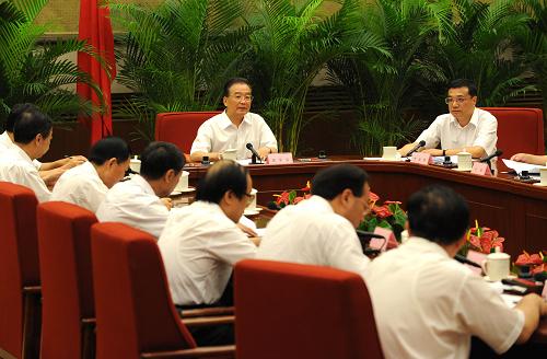 8月20日,國務院總理、國務院西部地區開發領導小組組長溫家寶在北京主持召開領導小組會議,討論并原則通過《關于應對國際金融危機保持西部地區經濟平穩較快發展的意見》。 國務院副總理、國務院西部地區開發領導小組副組長李克強出席會議。新華社記者 劉建生 攝