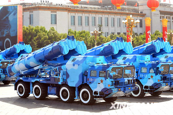 10月1日,首都各界慶祝中華人民共和國(guó)成立60周年大會(huì)在北京舉行。這是海軍岸艦導(dǎo)彈方隊(duì)通過天安門廣場(chǎng)。新華社記者李曉果攝