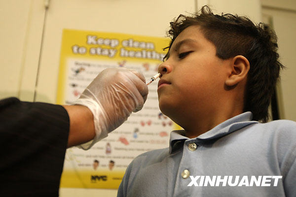 2009年10月28日,在美國紐約布魯克林區的第157公立小學,一名學生正在接種甲型流感疫苗鼻腔噴劑。新華社記者劉欣攝