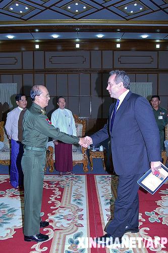 這張11月4日緬通社發(fā)布的照片顯示,美國主管東亞和太平洋地區(qū)事務的助理國務卿庫爾特坎貝爾(右)在緬甸新首都內比都會見緬甸政府總理登盛上將。坎貝爾4日晚在結束訪問緬甸前說,美國正準備采取步驟改善美緬關系。這是14年來美國高官首次訪問緬甸。新華社/法新