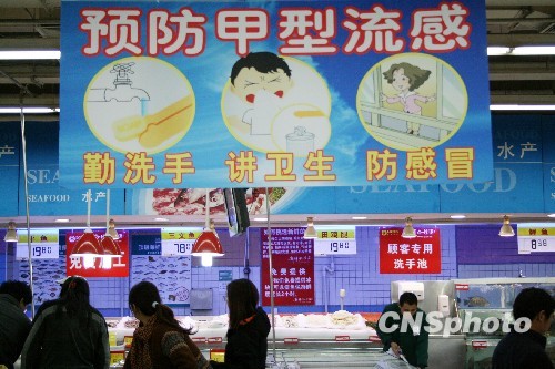 2009年11月10日,北京一超市打出“預防甲型流感”標語,提醒顧客注意個人衛生。 中新社發 任丘 攝