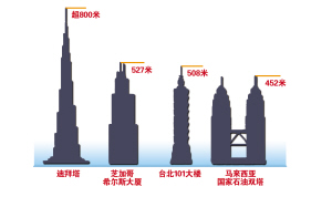 據英國《泰晤士報》1月3日報道,總高度至少超過800米、樓體169層的迪拜塔今日舉行竣工典禮,它的確切高度現在仍然是一個謎,但毫無疑問的是,這一世界最高建筑今后必將吸引世界的目光,深受債務危機丑聞困擾的迪拜政府也將借這一巨塔再次向世界證明迪拜的活力與輝煌。