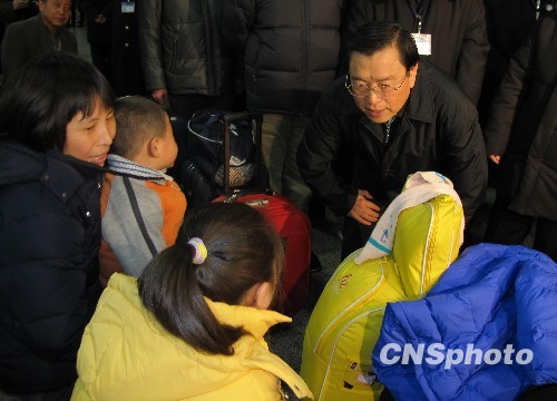 1月26日,中共中央政治局委員、國(guó)務(wù)院副總理張德江在北京西客站與一對(duì)候車準(zhǔn)備回家的豫籍農(nóng)民工一家交談。當(dāng)日,張德江一行抵達(dá)北京西站,視察了應(yīng)急指揮中心,聽(tīng)取了北京西站春運(yùn)工作匯報(bào),到候車室看望了候車旅客,到售票窗口了解車票發(fā)售情況。 中新社發(fā) 曹巍嵩 攝