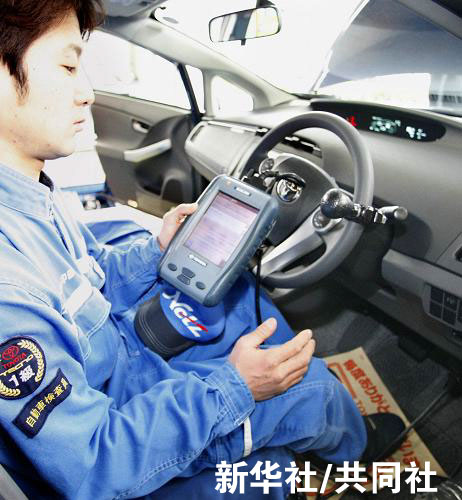 2月10日,在日本名古屋市,豐田公司檢修人員使用專用設備連接“普銳斯”的車載電腦,刷新剎車電子控制程序。日本豐田公司社長豐田章男9日宣布在日本國內召回混合動力車新版“普銳斯”等22.3萬輛車之后,豐田開始在日本全國的銷售店提供必要的修理服務。新華社/共同社