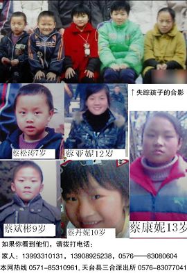 20日上午10點左右,有人給蔡修明的弟媳打來電話,說在三門縣嶺口見過5個孩子,可蔡家人到嶺口未見孩子的蹤影。這時,從嶺口發往寧海桑洲的一位司機說看到過5個小孩乘中巴車已到寧海。蔡家親戚趕往當地派出所調取了當時的監控錄像,但錄像比較模糊,不能確定那就是走失的蔡家姐弟。