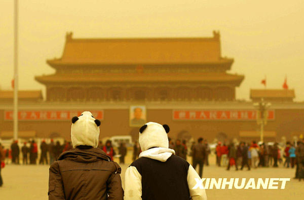 3月20日,兩名男子冒著浮塵游覽天安門廣場。新華社記者 周磊攝