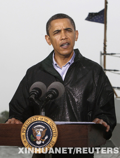 奧巴馬察看沿岸一處救災人員集結待命區,隨后乘坐直升機前往24公里外的一處沼澤地,從空中察看受災情況。