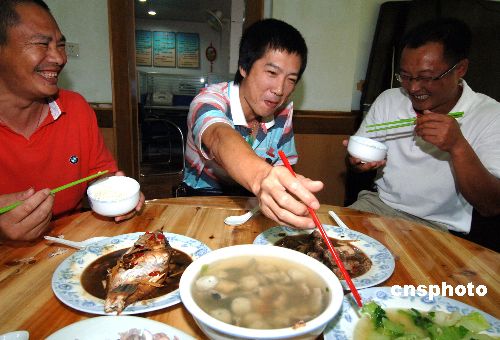 中秋佳節(jié)前夕,前來閩東霞浦縣三沙鎮(zhèn)招聘短期漁工的臺(tái)商陳樹旺(圖中),在閩東霞浦縣三沙臺(tái)胞公寓與這里的工作人員共進(jìn)午餐,感受“家庭”溫馨。近三十年來,閩東霞浦縣三沙港對(duì)臺(tái)小額貿(mào)易和民間漁鈔交易等經(jīng)營規(guī)模均居?xùn)|南沿海對(duì)臺(tái)經(jīng)貿(mào)的前列。 中新社發(fā) 劉可耕 攝