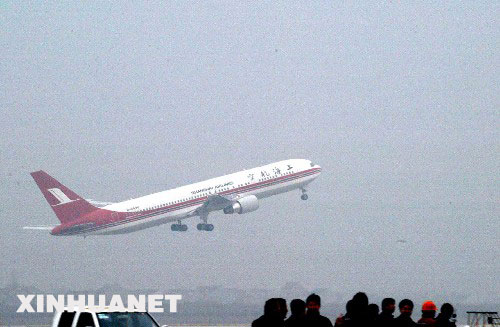 2003年以來(lái),兩岸春節(jié)包機(jī)已四度飛航,兩岸客運(yùn)包機(jī)節(jié)日化也已實(shí)現(xiàn)。2005年祖國(guó)大陸的民航客機(jī)完成56年來(lái)的首次赴臺(tái)飛航。圖為上航臺(tái)商春節(jié)包機(jī)FM807載著240多名臺(tái)商起飛(2005年1月29日攝)。 新華社發(fā)