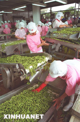 福建僑鄉(xiāng)龍海市目前已引進(jìn)150多家臺(tái)資企業(yè),其中有臺(tái)灣10大財(cái)團(tuán)中的4家,形成了電力、食品加工、制鐵印罐、旅游房地產(chǎn)等幾大臺(tái)資支柱產(chǎn)業(yè)。其中,臺(tái)資龍海冷凍食品有限公司是當(dāng)年中國(guó)生產(chǎn)能力最大的保鮮冷凍果蔬加工出口企業(yè)。產(chǎn)品銷往美國(guó)、日本等10多個(gè)國(guó)家和地區(qū),年出口值1.34億元。圖為工人在加工出口青毛豆(1998年10月攝)。 新華社發(fā)
