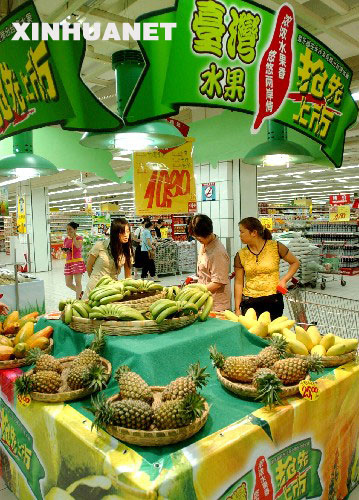 為促進(jìn)兩岸農(nóng)業(yè)交流與合作,2005年以來(lái),祖國(guó)大陸先后對(duì)30多種原產(chǎn)于臺(tái)灣的水果、蔬菜、水產(chǎn)品實(shí)施進(jìn)口零關(guān)稅措施,并3次緊急采購(gòu)臺(tái)灣豐產(chǎn)滯銷水果。圖為長(zhǎng)沙顧客正在挑選剛剛上柜的臺(tái)灣零關(guān)稅水果。 新華社發(fā)