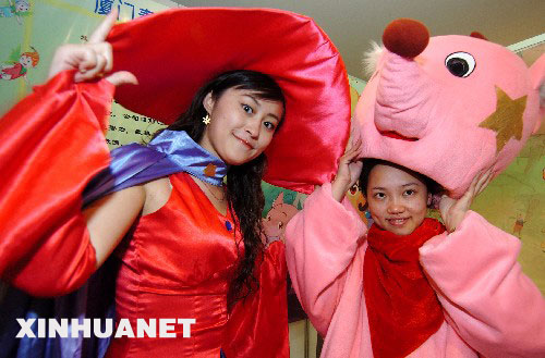 海峽兩岸動(dòng)漫展于2007年4月7日在廈門國(guó)際會(huì)展中心拉開(kāi)帷幕,有20家臺(tái)灣動(dòng)漫企業(yè)與大陸的同行共同參展。圖為兩名女孩在海峽兩岸動(dòng)漫展上表演動(dòng)畫(huà)明星真人秀(2007年4月7日攝)。 新華社發(fā)