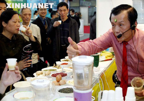 一位臺(tái)灣參展商在第六屆上海國(guó)際工業(yè)博覽會(huì)上向參觀者推介“好媳婦”營(yíng)養(yǎng)調(diào)理機(jī)(2004年11月4日攝)。 新華社發(fā)