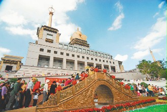 靈隱寺送給中臺禪寺一座“金橋”,信徒爭相通過這座象征溝通和解脫自在的“法橋”。(聯合報圖)