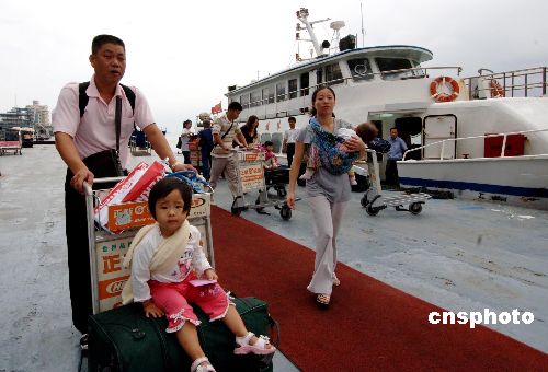 資料圖:2007年9月24日,離傳統中秋佳節僅剩一天時間,廈(門)金(門)航線比平時顯的更加忙碌,臺商紛紛往返廈金兩地過中秋。 中新社發 王東明 攝