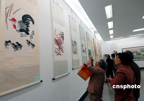 一月十一日,2008年迎新春中國大型書畫藝術作品展在福建福州畫院開幕。十多位兩岸書畫收藏家提供的近二百幅書畫精品紛紛亮相,其中不乏張大千、傅抱石、徐悲鴻、林散之等大師的書畫名作。 中新社發 王東明 攝