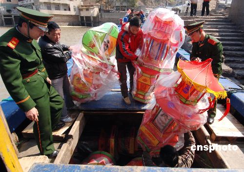 13日上午,象征“兩馬同春”的雙馬燈、喜氣洋洋的宮燈、走馬燈、手提燈,以及奧運(yùn)福娃造型的花燈共900多盞,在連江縣黃岐港裝船運(yùn)往馬祖(上圖),拉開了第六屆“兩馬同春鬧元宵”活動(dòng)的序幕。
