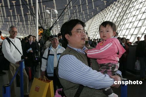 4月2日上午9時多,上海的許姓臺商攜幼女,在上海浦東機場搭乘大陸東方航空公司MU5005次清明包機返臺祭祖。據觀察,當日在上海啟動兩岸清明包機業務,客源豐沛、機票緊俏,可能與大陸首次實行“清明小長假”有關。 中新社發 潘索菲 攝