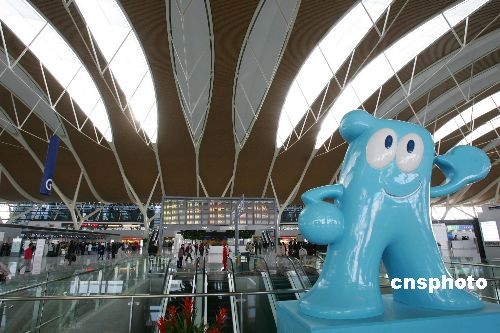 許多臺胞在登機前紛紛抓緊時間,與新航樓候機大廳內(nèi)的上海世博會吉祥物“海寶”雕塑合影留念。