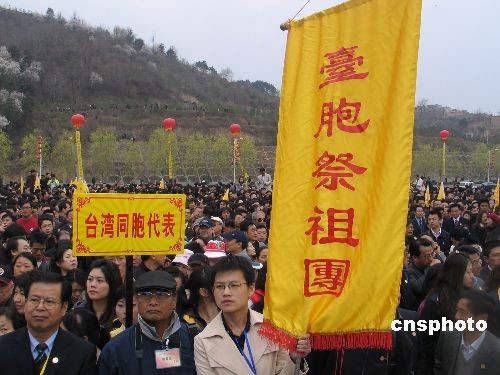 在祭祖隊列中,打著明黃色“臺灣祭祖團”旗幟的陣容十分醒目,大約三百余人,年齡多在四、五十歲之間。臺灣中國統一聯盟主席王津平告訴記者,此次他代表臺灣同胞向軒轅黃帝敬獻花籃,感到十分榮幸。他是第六次來參加黃帝陵祭祖活動,來到這里,感動加激動,因為這里的山脈連著華夏子孫的血脈,海峽兩岸血濃于水。