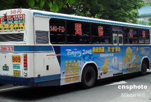 5月底,臺灣大洋金銀幣有限公司在臺北市至臺北縣的公交車上刊登最新的北京奧運金銀紀(jì)念幣廣告。 中新社發(fā) 陳立宇 攝