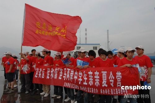 船身上懸掛的“沉痛地向汶川大地震中遇難同胞哀悼”、“炎黃子孫心連心,重建家園手牽手”的繁體字橫幅分外引人注目。據(jù)帶隊(duì)的馬祖高級(jí)中學(xué)校長(zhǎng)陳善茂介紹,橫幅是他們出發(fā)之前特意定制的,以此表達(dá)對(duì)受災(zāi)同胞的深切慰問。
