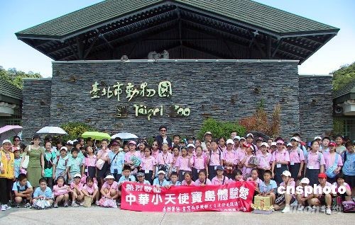 來自北京中關(guān)村第三小學(xué)的近百位“中華小天使”七月十五日在臺灣展開寶島夏令營行程,創(chuàng)下兩岸兒童交流人數(shù)最多的紀(jì)錄。此次來臺的小朋友平均年齡在十一歲左右,由十六位老師帶領(lǐng),他們于十四日抵達(dá)臺灣,在臺行程九天八夜。圖為在參觀臺北市立動物園前合影。 中新社發(fā) 徐長安 攝