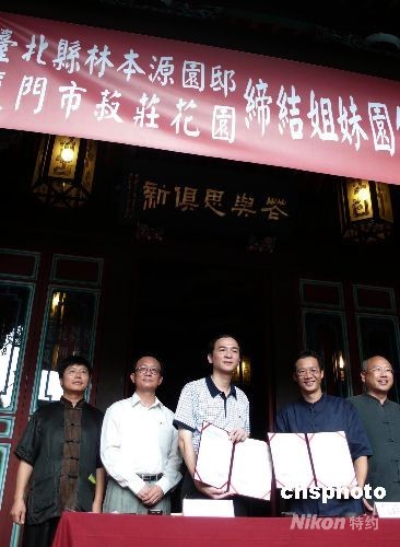 中新社臺北七月三十一日電 (記者 曾嘉 董會峰)廈門市菽莊花園與臺北縣林本源園邸(俗稱“林家花園”)三十一日在此間締結“姊妹園”,兩園將建立長期穩定交流機制,開展文化旅游交流合作。