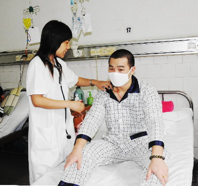 昨日,徐雅靖給劉小偉進行入艙前的檢查。檢查顯示,劉小偉已進入了移植前的最好狀態。 嚴慧平 攝