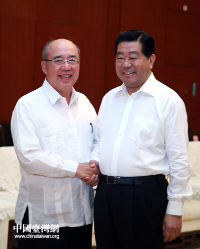 7月9日,中共中央政治局常委、全國政協(xié)主席賈慶林在廣州會見中國國民黨榮譽主席吳伯雄及應(yīng)邀參加第六屆兩岸經(jīng)貿(mào)文化論壇的兩岸各界人士。(中國臺灣網(wǎng) 鐘寶華 攝)