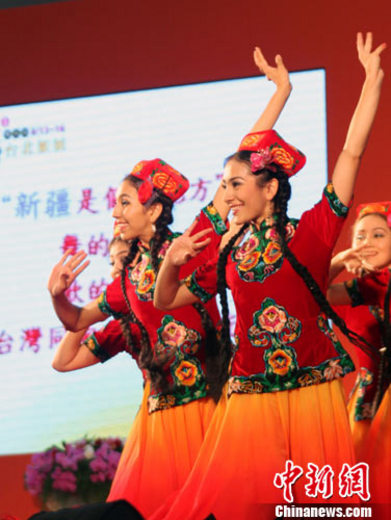 8月14日,來自新疆的少數民族舞者在第五屆海峽兩岸臺北旅展上帶來精彩的民族舞蹈。大陸31個省區市和新疆生產建設兵團的旅游協會組成約1200人的團隊來臺,并首度展銷合一、面向臺灣民眾推介旅游產品。中新社發 劉舒凌 攝