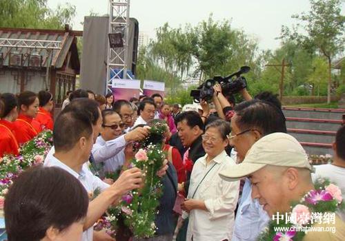 甘肅省各級領(lǐng)導為甘肅首批赴臺游客佩戴花籃 (圖片來源:甘肅省臺辦)