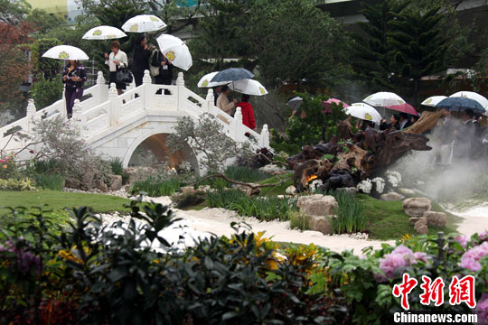 臺北花博在即將開幕之前,11月5日邀各方貴賓提前領(lǐng)略園內(nèi)精彩。而當天在濛濛細雨中精彩亮相的上海展園“海韻園”,吸引不少參觀客在此駐足流連。中新社發(fā) 王健 攝