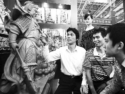 隨著兩岸關(guān)系漸漸春暖花開,兩岸民間宗教信仰交流日益頻繁,祖籍晉江的阿貴師也想到海峽西岸來瞻仰各地的神像,同時與大陸的神像雕刻師們切磋技藝,他的神像雕刻團隊上世紀(jì)八十年代末就移師浙江義烏,隨后又到福建惠安發(fā)展,去年他在廈門黃厝建起了600多平方米的廠房,決定在這里扎下根來!耙驗楦=ㄟ@地方跟臺灣特別接近,語言啊飲食啊習(xí)俗啊幾乎都一樣,這里給我的感覺最親切,F(xiàn)在坐飛機也好,走‘小三通’也好,回臺灣都很方便。更何況福建寺廟興盛,善男信女多,確實是我們發(fā)展事業(yè)的寶地。”現(xiàn)在阿貴師已派他27歲的小兒子來負(fù)責(zé)黃厝工廠的經(jīng)營管理,并希望他在廈門成家立業(yè),蔡家的下一代已有了做廈門人的準(zhǔn)備。