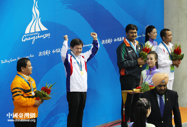 中華臺北選手郭柏成摘得廣州亞運會男子美式8球單打金牌。圖為郭柏成領獎。(中國臺灣網 鐘寶華 攝)