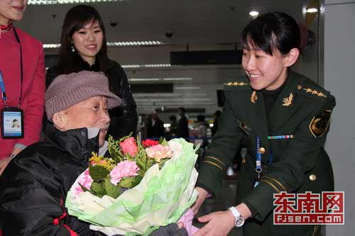 1月9日,春運首日,福州機場邊檢站工作人員為返回臺灣過春節(jié)的92歲臺胞朱希仁先生獻花祝福。