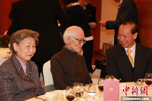資料圖:2011年3月,余光中等相聚南京大學臺北聯誼會。圖為著名詩人余光中(左二)及夫人(左一)與臺灣親民黨秘書長秦金生(右一)在晚宴上交流。中新社發 符永康 攝